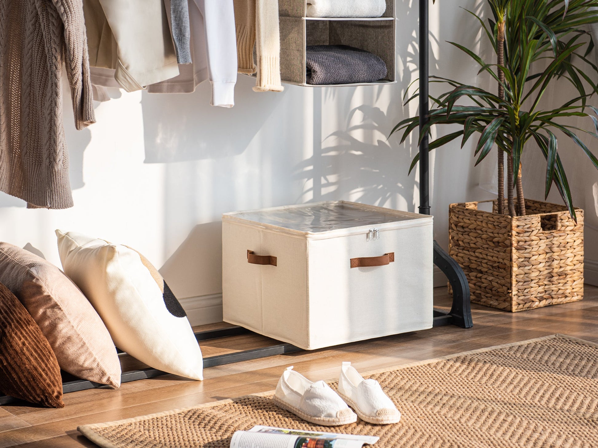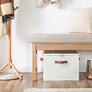 - The reinforced cardboard side panels and the inserted bottom plate ensure the space-saving shoe storage bin stays in shape even when pulled or under other pressure.